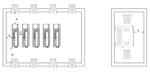 并排安装时,横向两侧建议各留 30mm 以上间距V1规格,无风扇结构,采用侧面散热片进行散热,因此必须留有30mm的间隙)。首尾两台驱动器与柜体侧面之间,至少留有 50mm 间隙。